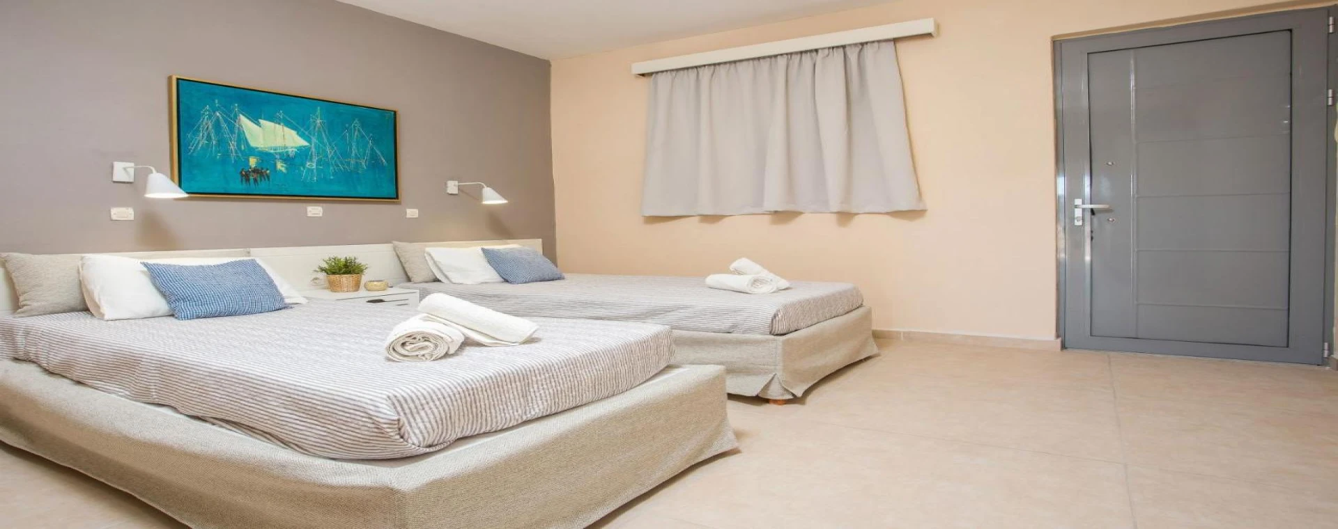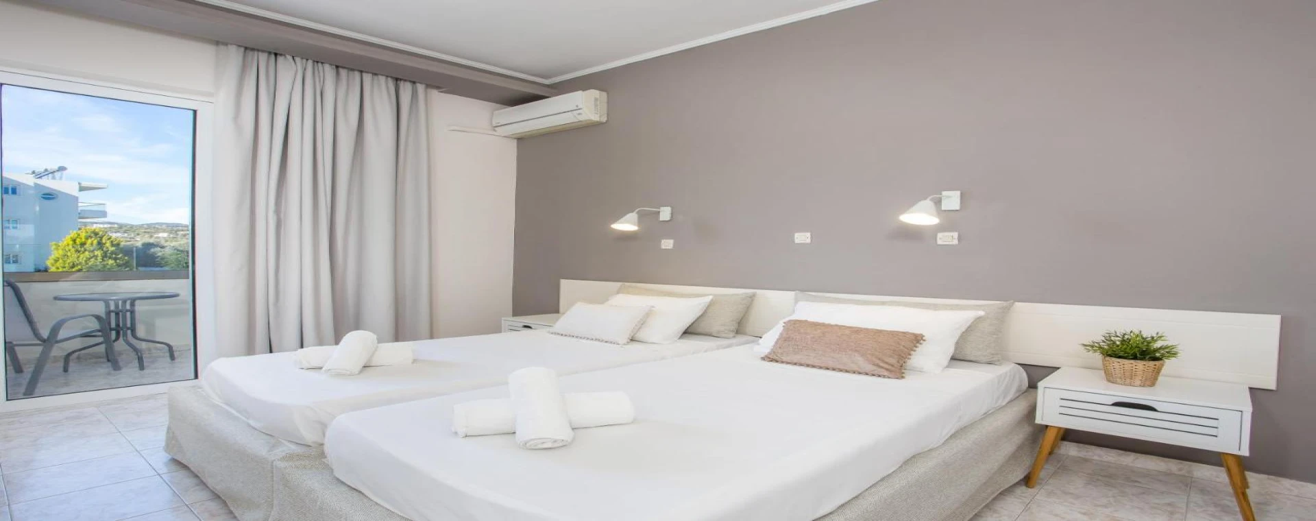 Every room at Evita Hotel opens onto a balcony offering serene garden or Aegean Sea vistas. Each room is equipped with a fridge for added convenience, while the private bathrooms feature refreshing showers.