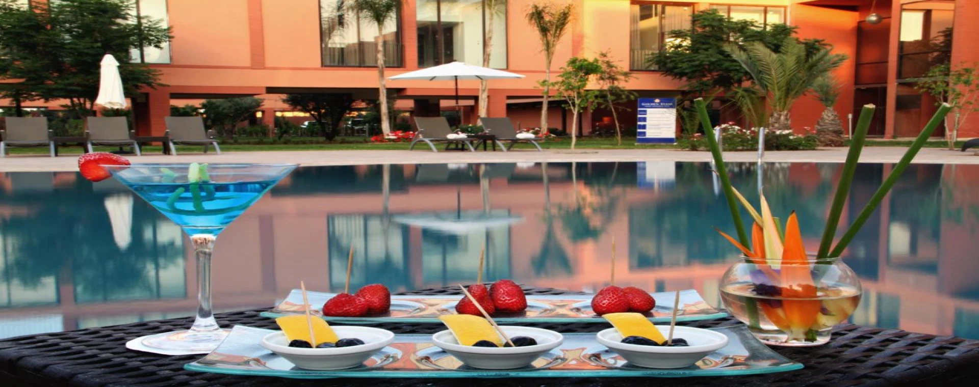 The restaurant at the Rawabi Hotel & Spa Marrakech serves both local Moroccan delicacies as well as international food. You will also find a lobby bar and pool bar. The hotel is an all-inclusive resort and this covers breakfast, lunch, dinner as well as selected drinks and snacks.